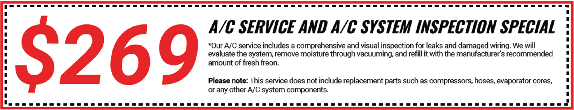 Stay cool with our $269 A/C service special! This offer includes a visual inspection for leaks or damage, moisture removal through vacuuming, and a recharge with fresh freon per manufacturer specs.